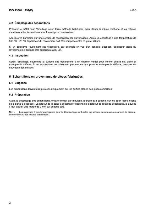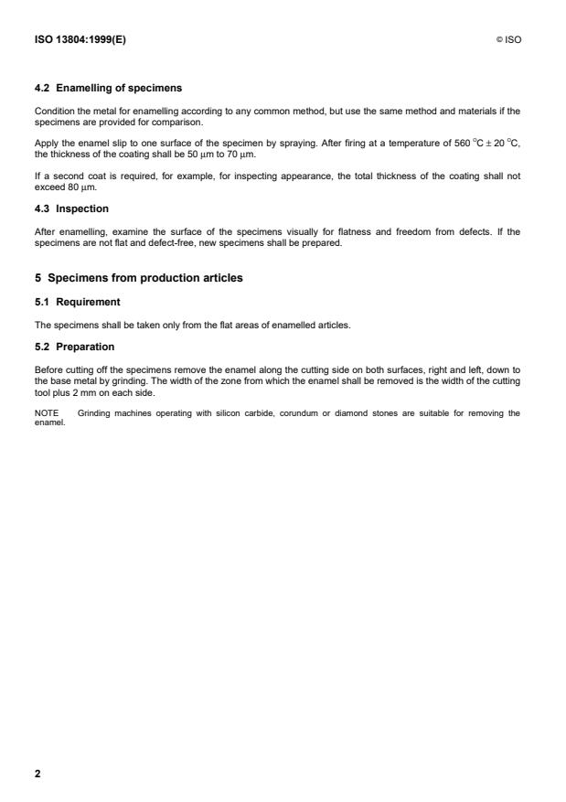 ISO 13804:1999 is a standard published by the International Organization for Standardization (ISO). Its full title is "Vitreous and porcelain enamels for aluminium — Production of specimens for testing". This standard covers: Vitreous and porcelain enamels for aluminium — Production of specimens for testing