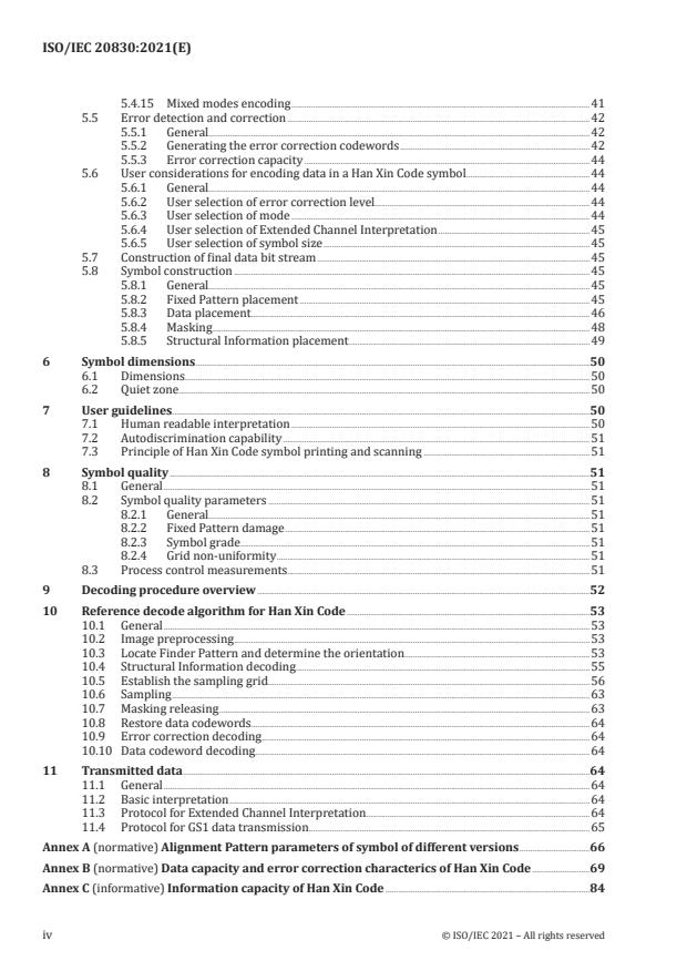 This document defines the requirements for the symbology known as Han Xin Code. It specifies the Han Xin Code symbology characteristics, data encoding process, symbol structure, dimensions and print quality requirements, error correction rules, reference decoding algorithm, and user-selectable application parameters.
