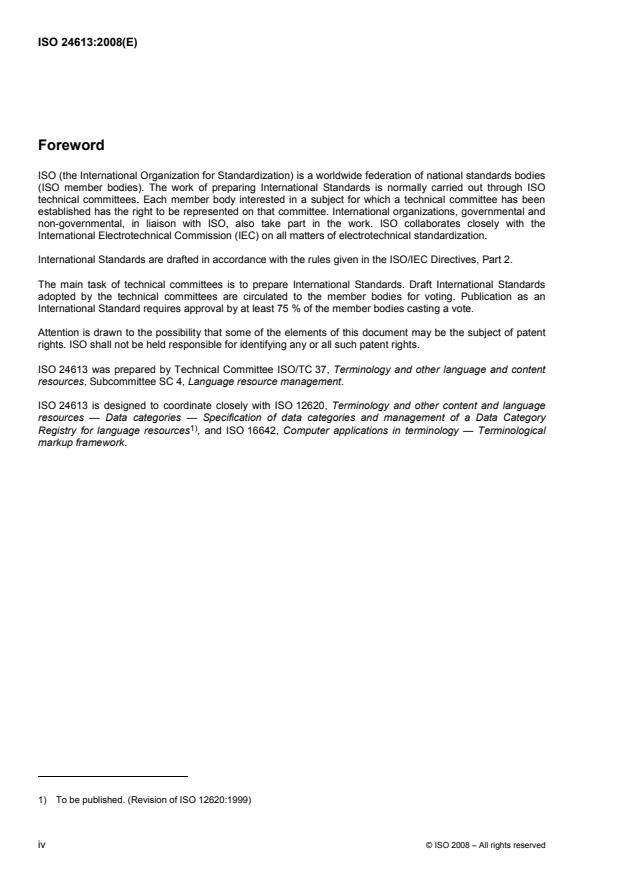 ISO 24613:2008 is a standard published by the International Organization for Standardization (ISO). Its full title is "Language resource management - Lexical markup framework (LMF)". This standard covers: ISO 24613:2008 describes the Lexical Markup Framework (LMF), a metamodel for representing data in lexical databases used with monolingual and multilingual computer applications. LMF provides mechanisms that allow the development and integration of a variety of electronic lexical resource types. These mechanisms will present existing lexicons as far as possible. If this is impossible, problematic information will be identified and isolated.