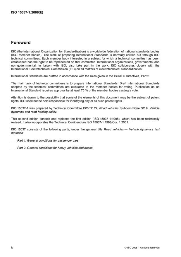 ISO 15037-1:2006 specifies the general conditions that apply when vehicle dynamics properties are determined according to ISO test methods. In particular, it specifies general conditions for: variables, measuring equipment and data processing, environment (test track and wind velocity), test vehicle preparation (tuning and loading), initial driving, and test reports (general data and test conditions). ISO 15037-1:2006 is applicable to passenger cars as defined in ISO 3833 and light trucks.