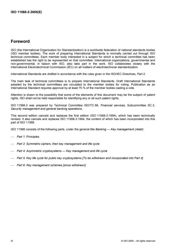 ISO 11568-2:2005 specifies techniques for the protection of symmetric and asymmetric cryptographic keys in a retail banking environment using symmetric ciphers and the life-cycle management of the associated symmetric keys. The techniques described enable compliance with the principles described in ISO 11568-1. The techniques described are applicable to any symmetric key management operation.