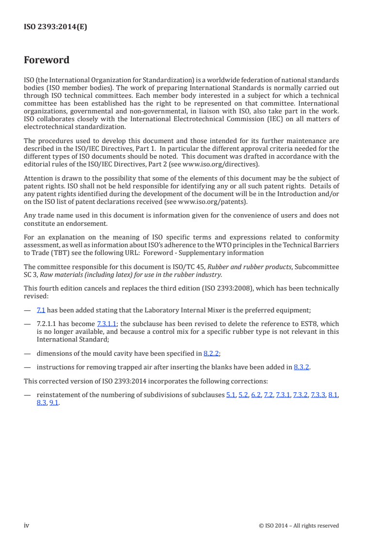 ISO 2393:2014 is a standard published by the International Organization for Standardization (ISO). Its full title is "Rubber test mixes - Preparation, mixing and vulcanization - Equipment and procedures". This standard covers: ISO 2393:2014 specifies the equipment and procedures for the preparation, mixing, and vulcanization of rubber test mixes specified in the various International Standards for the evaluation of such test mixes.