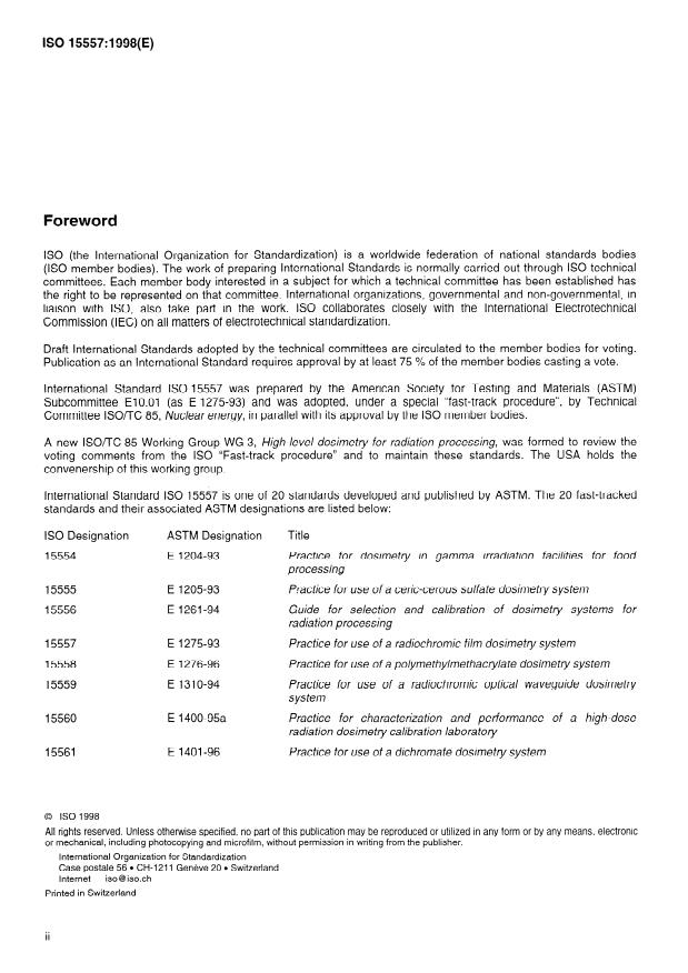 ISO 15557:1998 is a standard published by the International Organization for Standardization (ISO). Its full title is "Practice for use of a radiochromic film dosimetry system". This standard covers: Practice for use of a radiochromic film dosimetry system
