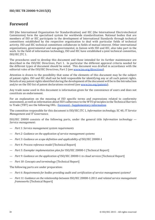ISO/IEC TR 20000-9:2015 is a technical report published by the International Organization for Standardization (ISO). Its full title is "Information technology - Service management - Part 9: Guidance on the application of ISO/IEC 20000-1 to cloud services". This standard covers: ISO/IEC TR 20000-9:2015 provides guidance on the use of ISO/IEC 20000‑1:2011 for service providers delivering cloud services. It is applicable to different categories of cloud service, such as those defined in ISO/IEC 17788/ITU-T Y.3500 and ISO/IEC 17789/ITU-T Y.3502, including, but not limited to, the following: a) infrastructure as a service (IaaS); b) platform as a service (PaaS); c) software as a service (SaaS). It is also applicable to public, private, community, and hybrid cloud deployment models. The applicability of ISO/IEC 20000‑1 is independent of the type of technology or service model used to deliver the services. All requirements in ISO/IEC 20000‑1 can be applicable to cloud service providers. The structure of ISO/IEC TR 20000-9:2015 does not follow the structure of ISO/IEC 20000‑1. The guidance is presented as a set of scenarios that can address many of the typical activities of a cloud service provider. The guidance in ISO/IEC TR 20000-9:2015 can also be useful for customers of cloud service providers. This part of ISO/IEC TR 20000-9:2015 can be used as guidance for a cloud service provider in designing, managing, or improving an SMS to support cloud services. ISO/IEC TR 20000-9:2015 does not add any requirements to those stated in ISO/IEC 20000‑1 and does not state explicitly how evidence can be provided to an assessor or auditor. The scope of ISO/IEC TR 20000-9:2015 excludes any specifications for products or tools.