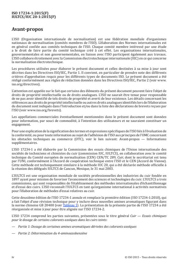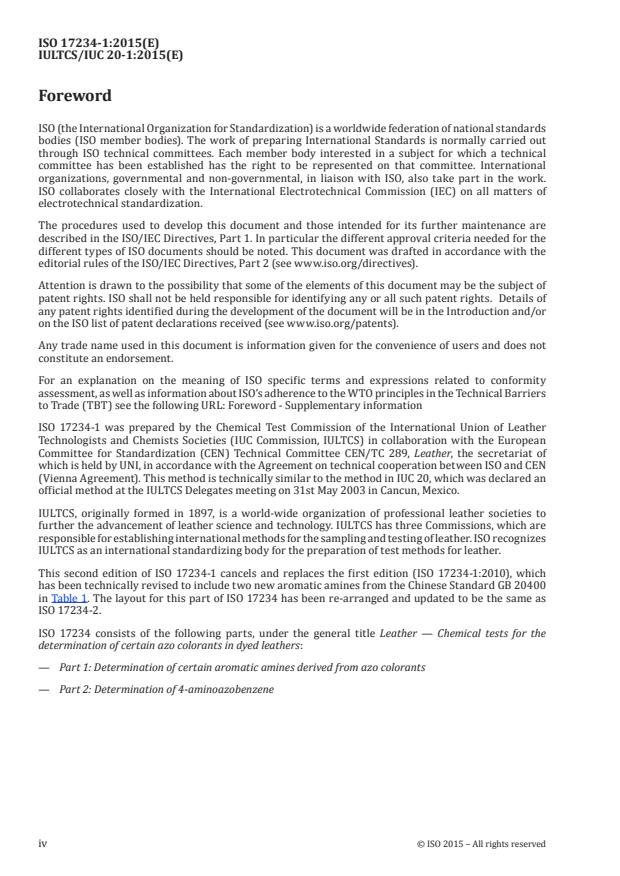 ISO 17234-1:2015 is a standard published by the International Organization for Standardization (ISO). Its full title is "Leather — Chemical tests for the determination of certain azo colorants in dyed leathers — Part 1: Determination of certain aromatic amines derived from azo colorants". This standard covers: ISO 17234-1:2015 specifies a method for determining the use of certain azo colorants which can release certain aromatic amines.