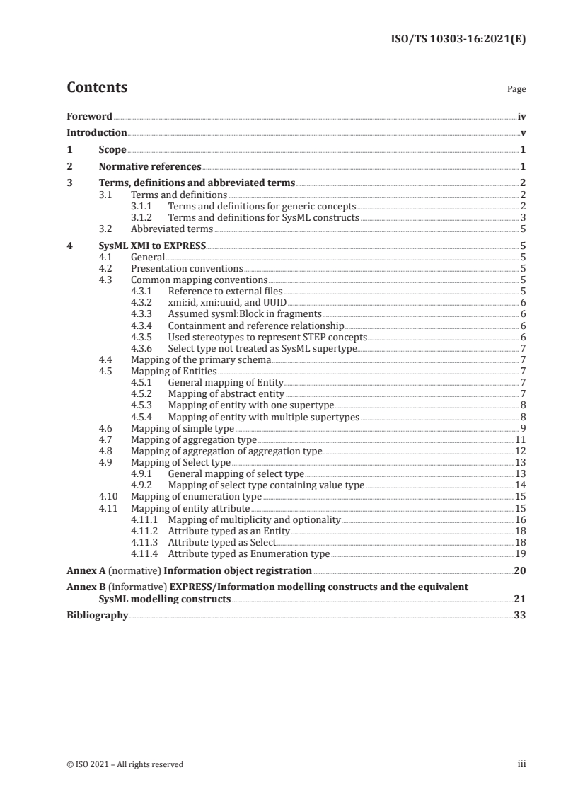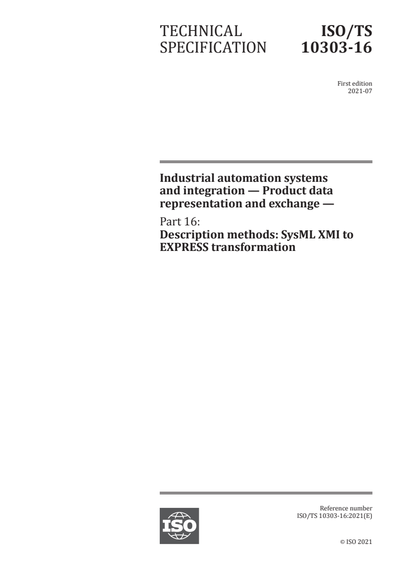 ISO/TS 10303-16:2021 - Industrial automation systems and integration — Product data representation and exchange — Part 16: Description methods: SysML XMI to EXPRESS transformation Released:7/6/2021