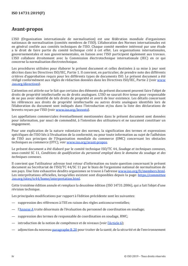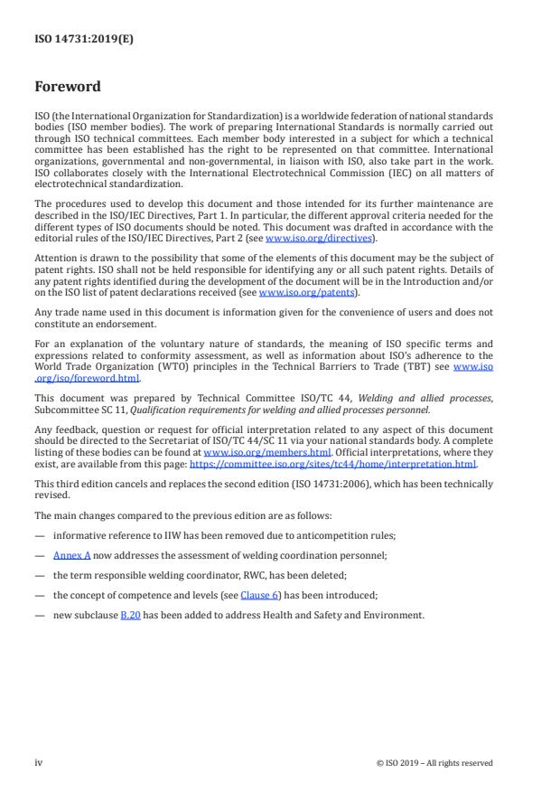 ISO 14731:2019 is a standard published by the International Organization for Standardization (ISO). Its full title is "Welding coordination — Tasks and responsibilities". This standard covers: This document identifies the essential welding quality related tasks and responsibilities included in welding coordination. The principle of an assessment according to this document is that welding coordination personnel need to be competent in the welding-related tasks allocated to them. It is presumed that welding coordination personnel have the necessary education, qualifications and experience and are appointed by the manufacturer. Regulatory documents, application standards and contracts can give specific requirements for welding coordination personnel. Otherwise, it is the responsibility of the manufacturer to determine the requirements to be in compliance with this document.