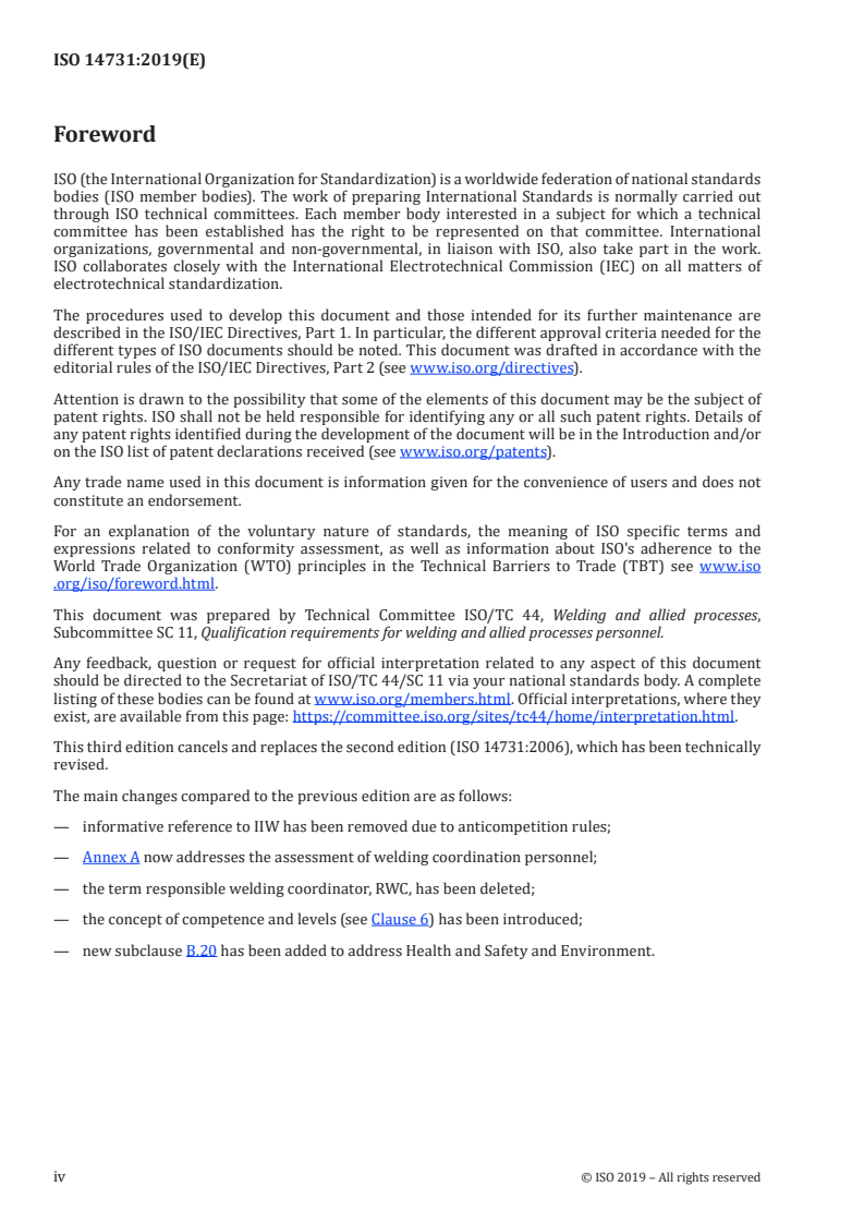 ISO 14731:2019 is a document that outlines the tasks and responsibilities involved in welding coordination. The document emphasizes the importance of competence in welding-related tasks for personnel responsible for welding coordination. It is assumed that these personnel have the necessary education, qualifications, and experience, and are appointed by the manufacturer. Regulatory documents, application standards, and contracts may provide specific requirements for welding coordination personnel. If not specified, it is the manufacturer's responsibility to determine the requirements needed to comply with this document.