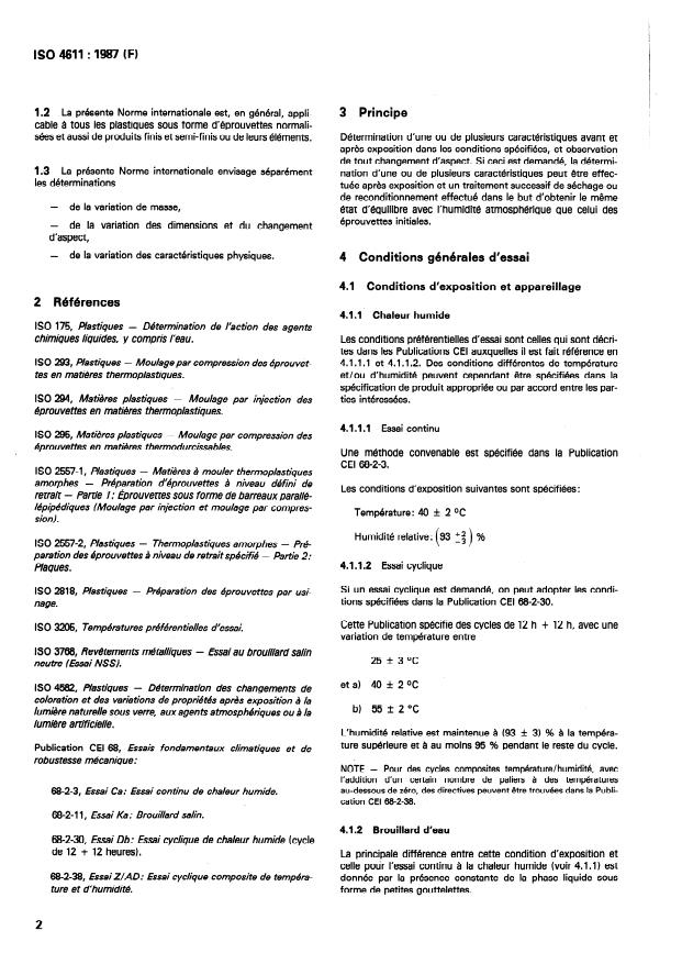 ISO 4611:1987 - Plastiques -- Détermination des effets d'une exposition a la chaleur humide, au brouillard d'eau et au brouillard salin