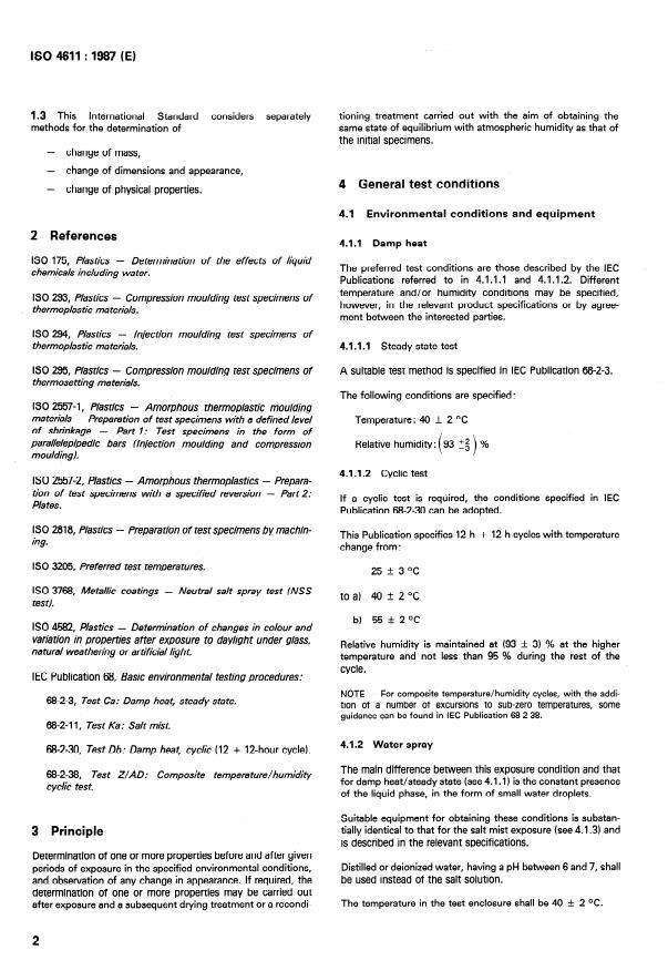 ISO 4611:1987 is a standard published by the International Organization for Standardization (ISO). Its full title is "Plastics — Determination of the effects of exposure to damp heat, water spray and salt mist". This standard covers: Specifies the exposure conditions of plastics under test to damp heat (steady state test or cyclic test), to water spray and to sodium chloride salt mist. Determination of one or more properties before and after given periods of exposure in the specified environmental conditions and observation of any change appearance. The test duration shall be as specified in the relevant standard or as agreed upon by the interested parties with reference to the intended application.