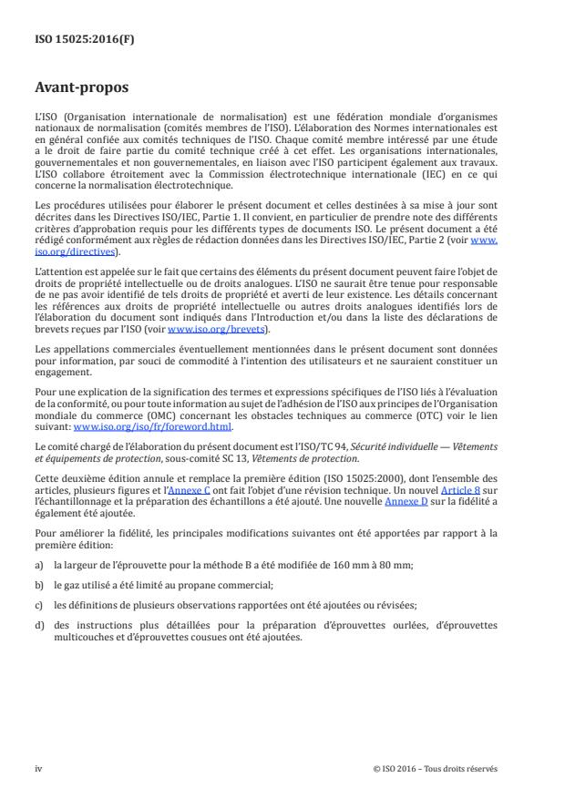 ISO 15025:2016 spécifie deux méthodes (allumage par la surface et allumage par le bord inférieur) pour déterminer les propriétés de propagation de la flamme des matériaux flexibles orientés verticalement par rapport à une flamme définie de petite taille; il peut s'agir d'étoffes simples ou multiples (textiles enduits, matelassé, multicouches, en sandwich et autres structures). Cette norme d'essai ne s'applique pas aux situations avec apport d'air réduit ou d'exposition à des sources importantes de chaleur intense, pour lesquelles les méthodes d'essai sont plus appropriées. Cette méthode d'essai n'est pas adaptée aux matériaux qui présentent une fusion ou une rétraction importante.