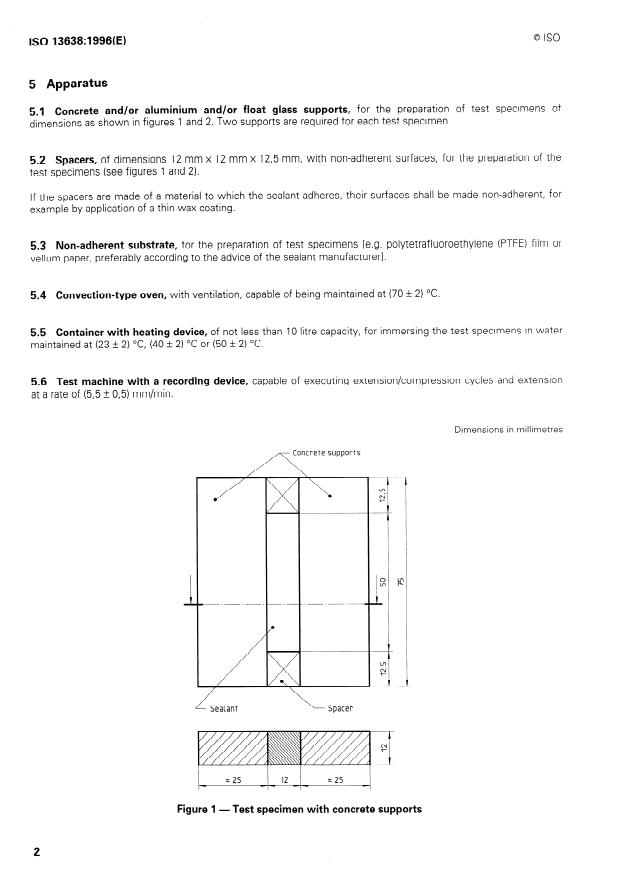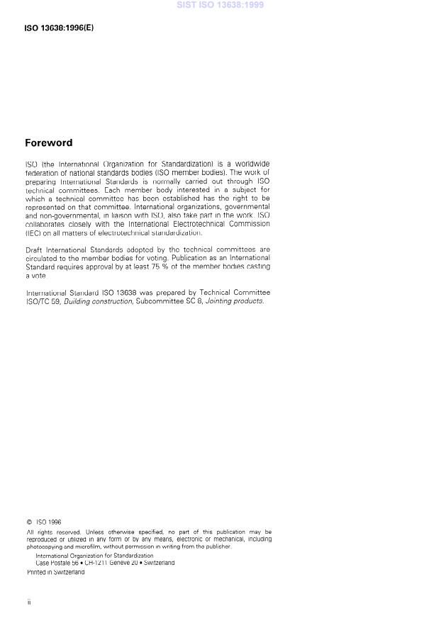 ISO 13638:1996 is a standard published by the International Organization for Standardization (ISO). Its full title is "Building construction — Sealants — Determination of resistance to prolonged exposure to water". This standard covers: Describes a method for the determination of the ability of sealants to resist differing degrees of exposure to water under conditions of service. Assesses for specified duration of time the ability of the sealant to fulfill its essential functions, principally to withstand joint movements.