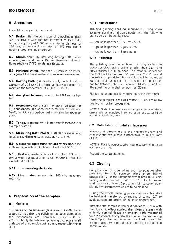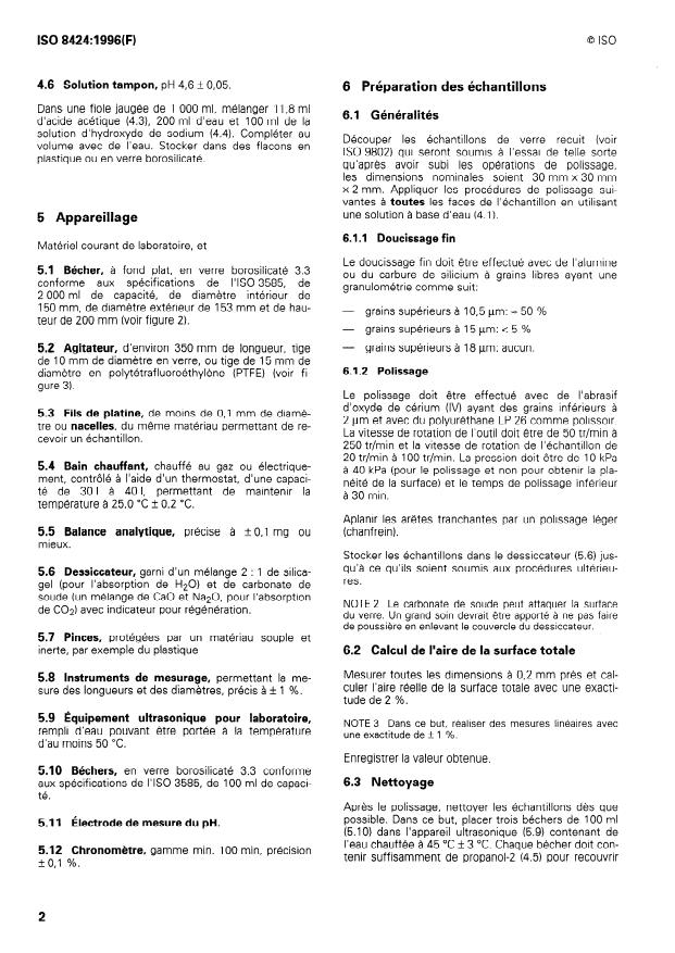 ISO 8424:1996 is a standard published by the International Organization for Standardization (ISO). Its full title is "Raw optical glass — Resistance to attack by aqueous acidic solutions at 25 degrees C — Test method and classification". This standard covers: La présente Norme internationale prescrit une méthode d'essai pour la résistance des verres optiques bruts à l'attaque par des solutions acides aqueuses à 25 °C ainsi qu'une classification des verres d'optique conformément à leur résistance aux acides déterminée à l'aide de cette méthode. La présente Norme internationale donne une première idée de la stabilité chimique du verre soumis à l'essai. Elle est applicable aux échantillons de tous verres d'optique bruts. NOTE 1 La méthode d'essai peut également être utilisée pour d'autres types de verres.