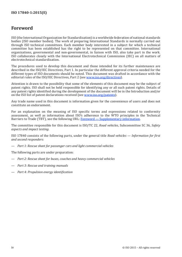 ISO 17840-1:2015 defines the content and the layout of the rescue sheet providing necessary and useful information about a vehicle involved in an accident to support the rescue team extricating the occupants as fast and as safe as possible. The contents and layout takes into account that the rescue sheet has to be easy to use by rescue teams of all over the world and can be available in paper or electronic format. ISO 17840-1:2015 is applicable to passenger cars and light commercial vehicles according to ISO 3833. The identification of the vehicle and of the model through a database using the license plate, the VIN number, an automatic emergency call systems (e.g. eCall) system or other identifiers (e.g. bar code or QR code) is not covered by this part of ISO 17840. The rescue process or the process of handling the rescue sheets is not covered by this part of ISO 17840. ISO 17840-1:2015 does not cover information related to education and training for rescue teams.