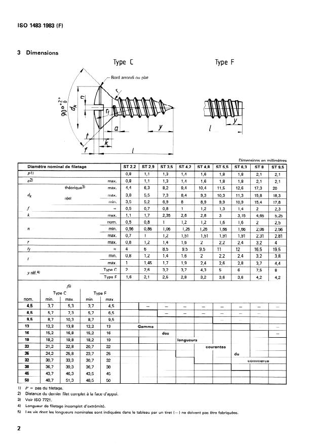Specifies the characteristics of screws with thread sizes from ST 2,2 up to and including ST 9,5; includes specifications with reference to International Standards; gives an example for the designation.