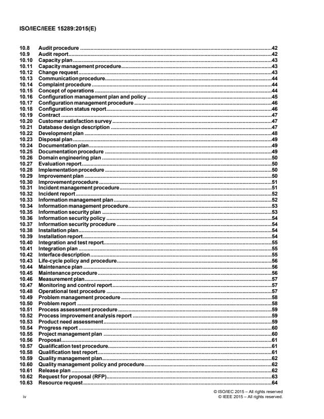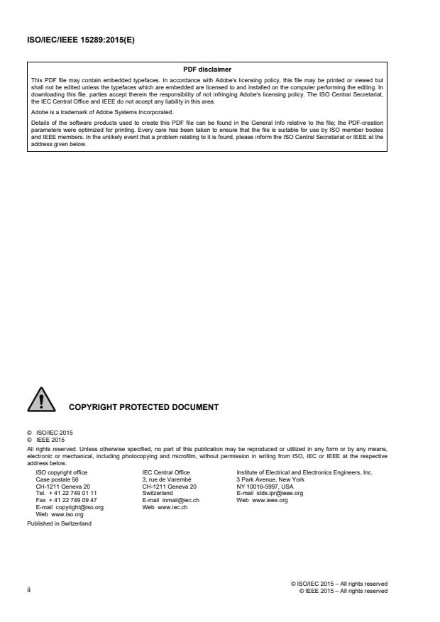 ISO/IEC/IEEE 15289:2015 provides requirements for identifying and planning the specific information items (information products, documentation) to be developed and revised during systems and software life cycles and service processes. It specifies the purpose and content of all identified systems and software data records and life-cycle information items, as well as records and information items for information technology service management. The information item contents are defined according to generic document types (description, plan, policy, procedure, report, request, and specification) and the specific purpose of the document. For simplicity of reference, each information item is described as if it were published as a separate document. However, information items may be unpublished but available in a repository for reference, divided into separate documents or volumes, or combined with other information items into one document. ISO/IEC/IEEE 15289:2014 is based on the life-cycle processes specified in ISO/IEC 12207:2008 (IEEE Std 12207-2008) and ISO/IEC 15288:2008 (IEEE Std 15288-2008), and the service management processes specified in ISO/IEC 20000-1:2011 (IEEE Std 20000-1:2013) and ISO/IEC 20000-2:2012 (IEEE Std 20000-2:2013).