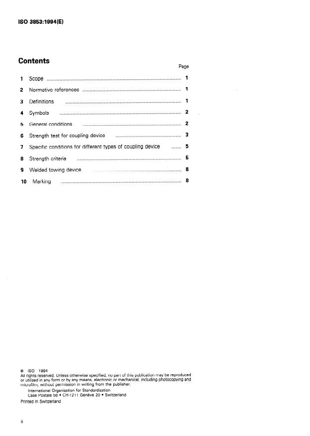 ISO 3853:1994 is a standard published by the International Organization for Standardization (ISO). Its full title is "Road vehicles — Towing vehicle coupling device to tow caravans or light trailers — Mechanical strength test". This standard covers: Cancels and replaces the first edition (1977). Specifies a simplified procedure for testing the mechanical strength of coupling devices fitted to towing vehicles for towing caravans or light trailers of categories O1 and O2.