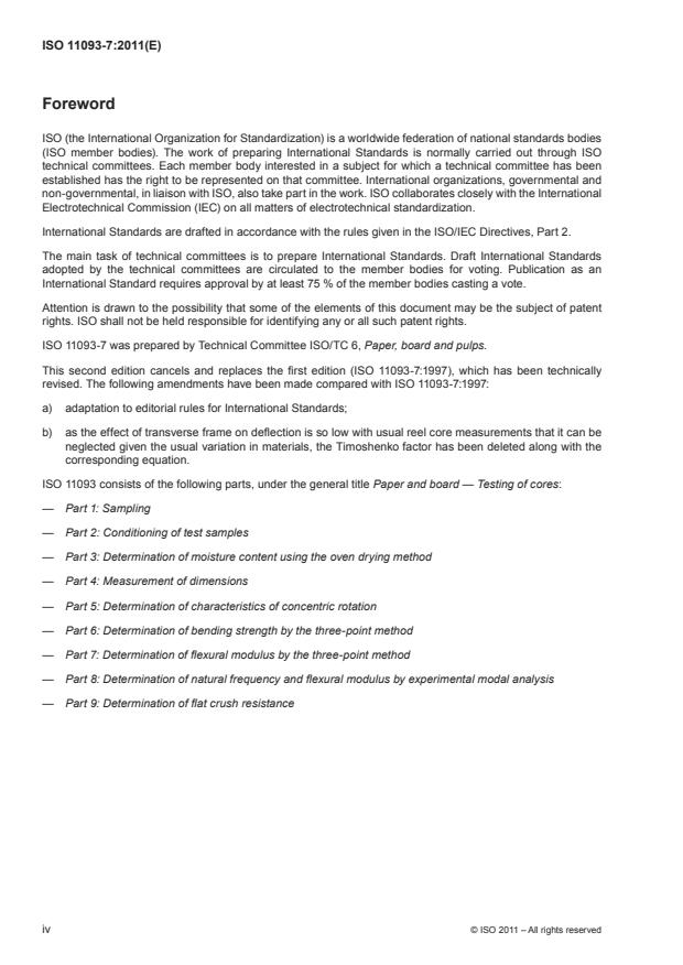 ISO 11093-7:2011 is a standard published by the International Organization for Standardization (ISO). Its full title is "Paper and board - Testing of cores - Part 7: Determination of flexural modulus by the three-point method". This standard covers: ISO 11093-7:2011 specifies a method for the determination, by the three-point method, of the flexural modulus of cylindrical paper and board cores, which meet the following criteria: internal diameter: 50 mm to 350 mm; minimum wall thickness: 0,05 × internal diameter, but not less than 10,0 mm; minimum length of core: 10 × internal diameter, but not less than 1 000 mm.