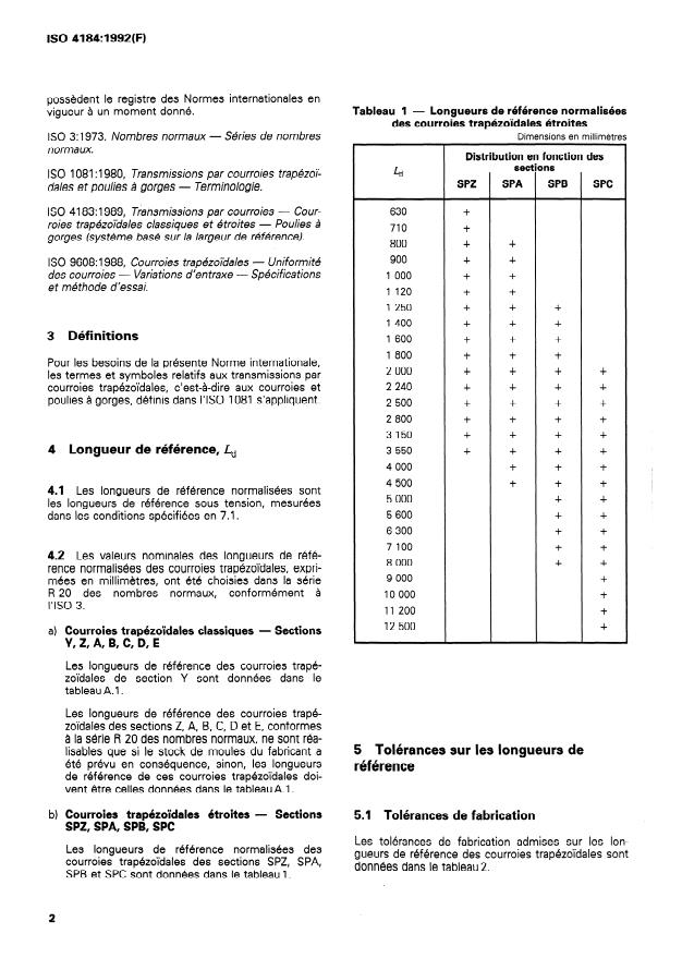 La présente Norme internationale prescrit pour les courroies trapézoïdales classiques et étroites de sections Y (pour gorges de poulies de 5,3 mm de largeur de référence), Z (pour gorges de poulies de 8,5 mm de largeur de référence), A (pour gorges de poulies de 11 mm de largeur de référence), B (pour gorges de poulies de 14 mm de largeur de référence), C (pour gorges de poulies de 19 mm de largeur de référence), D (pour gorges de poulies de 27 mm de largeur de référence), E (pour gorges de poulies de 32 mm de largeur de référence), SPZ (pour gorges de poulies de 8,5 mm de largeur de référence), SPA (pour gorges de poulies de 11 mm de largeur de référence), SPB (pour gorges de poulies de 14 mm de largeur de référence), SPC (pour gorges de poulies de 19 mm de largeur de référence): -- les longueurs de référence recommandées; -- les tolérances sur les longueurs de référence; -- les variations d'entraxe; -- les conditions de contrôle de la longueur de référence et de la variation d'entraxe. Les courroies trapézoïdales de sections Y, Z, A, B, C, D, E sont appelées courroies trapézoïdales classiques, et celles de sections SPZ, SPA, SPB et SPC, courroies trapézoïdales étroites. Il est important que les courroies étroites ne 100soient pas utilisées avec des poulies destinées aux seules courroies classiques.