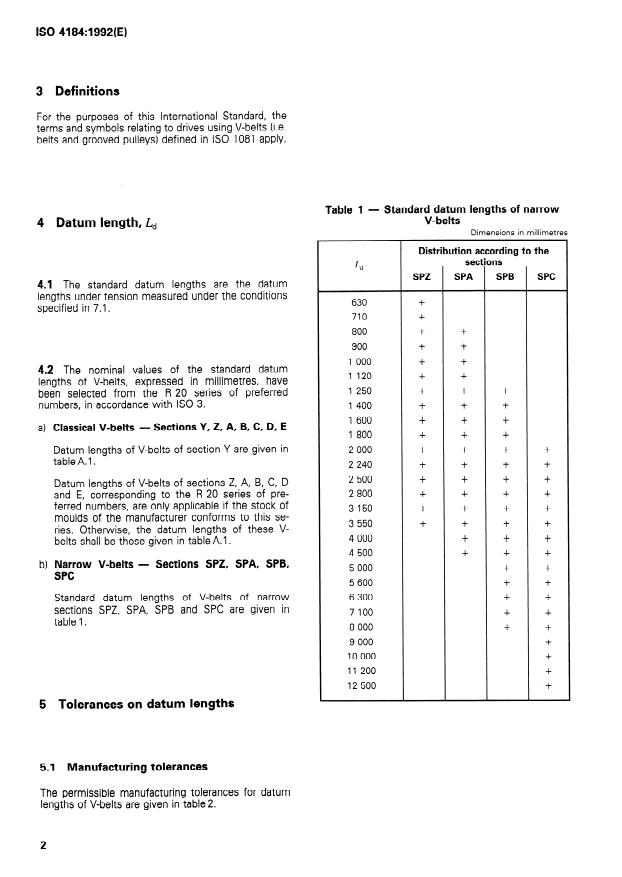 - Standard datum lengths: Nominal datum lengths selected from preferred‑number series (R20 / R10); tables list standard lengths for narrow belts (Table 1) and classical belts (Annex A/Table A.1).