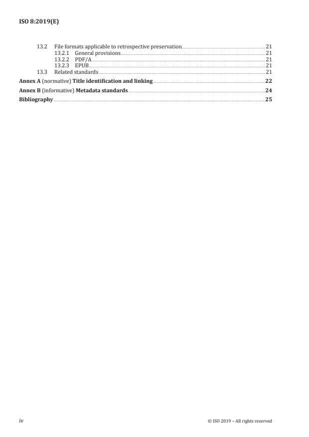 ISO 8:2019 - Information and documentation - Presentation and identification of periodicals - defines the minimum characteristics and recommendations for how periodicals should present and identify title and descriptive information across media. Updated in 2019 from the original 1977 edition, this standard expands guidance to print, born-digital and retrospectively digitized periodicals, covering title presentation, persistent identifiers (notably ISSN), citation practice, and the “footprints” of digital periodicals (URL and publisher changes) that affect long‑term discoverability and access.