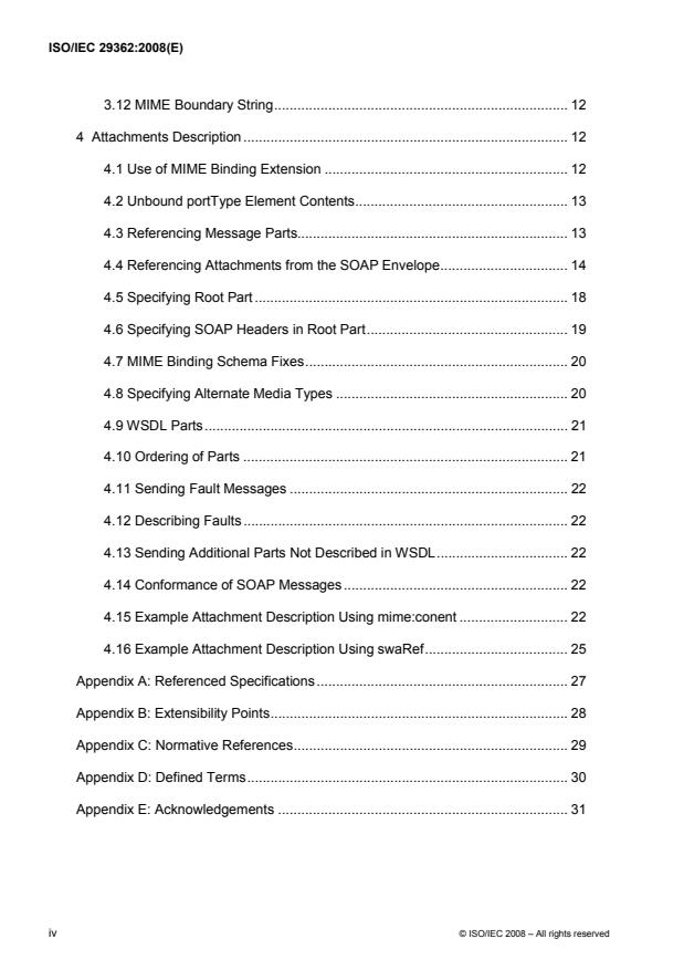 ISO/IEC 29362:2008 defines the WS-I Attachments Profile 1.0, consisting of a set of non-proprietary Web services specifications, along with clarifications and amendments to those specifications that are intended to promote interoperability. It complements the WS-I Basic Profile 1.1 (ISO/IEC 29361:2008) to add support for interoperable SOAP Messages with Attachments-based Web services.