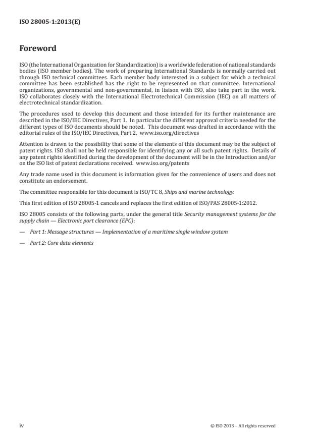 ISO 28005-1:2013 is a standard published by the International Organization for Standardization (ISO). Its full title is "Security management systems for the supply chain - Electronic port clearance (EPC) - Part 1: Message structures". This standard covers: 1 Scope This part of ISO 28005 specifies necessary guidance information related to electronic port clearance (EPC), such as message transmission requirements, business scenarios, message structures and software requirements. Within the context of this part of ISO 28005, EPC incudes the activities that a user, such as a ship's master, a shipping agency or a ship owner undertakes to submit electronic data to appropriate organizations that approve or reject the clearance for the ship to enter or leave port. Annex A provides implementation advice for a single window (SW). Annex B suggests a methodology for the development of a SW. This part of ISO 28005 defines XML message structures for the transmission of information between a ship or its representatives and certain organizations responsible for the processing of the ship's port clearance request. The information intended to be transferred is that which is defined by the FAL Convention and other related international instruments as identified by ISO 28005-2. These message structures are primary intended for machine -to- machine data transfers. This part of ISO 28005 allows different configurations of the SW, from a minimum solution to support basic clearance requirements to a more complex system to facilitate more extensive cooperation between ship and shore organizations.