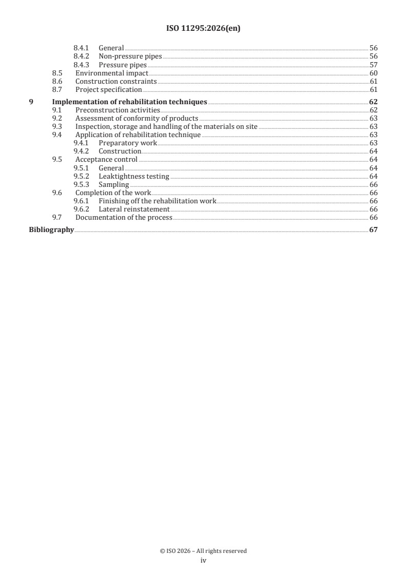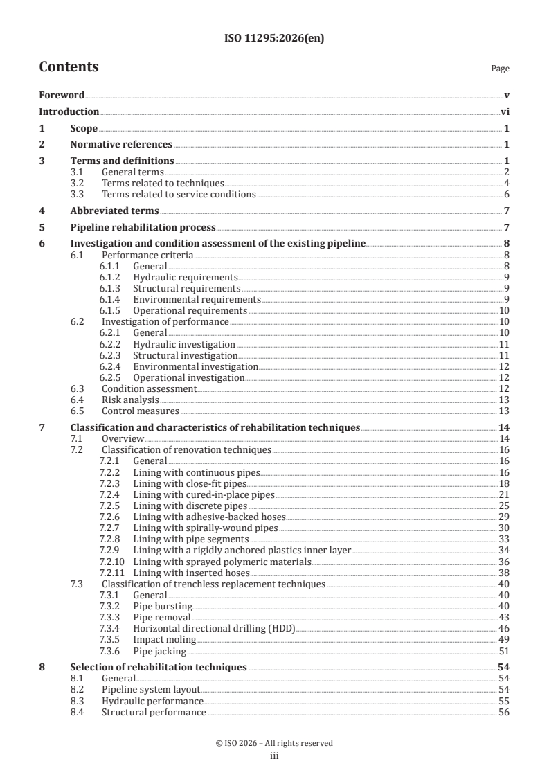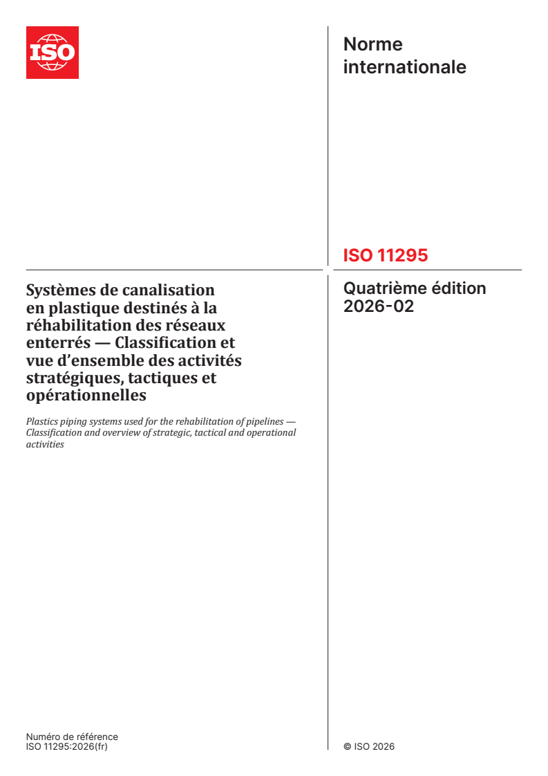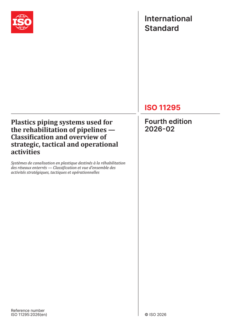 ISO 11295:2026 is a standard published by the International Organization for Standardization (ISO). Its full title is "Plastics piping systems used for the rehabilitation of pipelines — Classification and overview of strategic, tactical and operational activities". This standard covers: This document establishes the steps of the overall process of pipeline rehabilitation, comprising: strategic and tactical activities: investigation and condition assessment of the existing pipeline; pipeline rehabilitation planning; operational activities: project specification; applications of techniques; documentation of the design and application process. This document defines general terms of pipeline rehabilitation and establishes the classification of families of renovation and trenchless replacement techniques, with description of their respective features. This document is applicable to underground drains and sewers and underground water and gas supply networks. This document does not apply to: new construction provided as network extensions; calculation methods to determine, for each viable technique, the characteristics of lining or replacement pipe material needed to secure the desired performance of the rehabilitated pipeline; techniques providing non-structural pipe liners; techniques for repair.