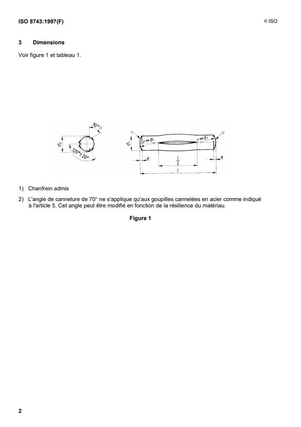 ISO 8743:1997 is a standard published by the International Organization for Standardization (ISO). Its full title is "Grooved pins - Half-length centre grooved". This standard covers: La présente Norme internationale prescrit les caractéristiques des goupilles cannelées en acier ou en acier inoxydable austénitique, à trois cannelures centrales constantes sur la moitié de leur longueur, non débouchantes et régulièrement espacées, de diamètre nominal, d1, de 1,5 mm à 25 mm inclus. Le matériau refoulé de chaque côté des cannelures forme un renflement dont le diamètre d2, supérieur au diamètre nominal d1, permet un ajustement serré de ces goupilles cannelées lorsqu'elles sont emmanchées en force dans un trou de diamètre de perçage égal au diamètre nominal de la goupille d1 (voir article 4).