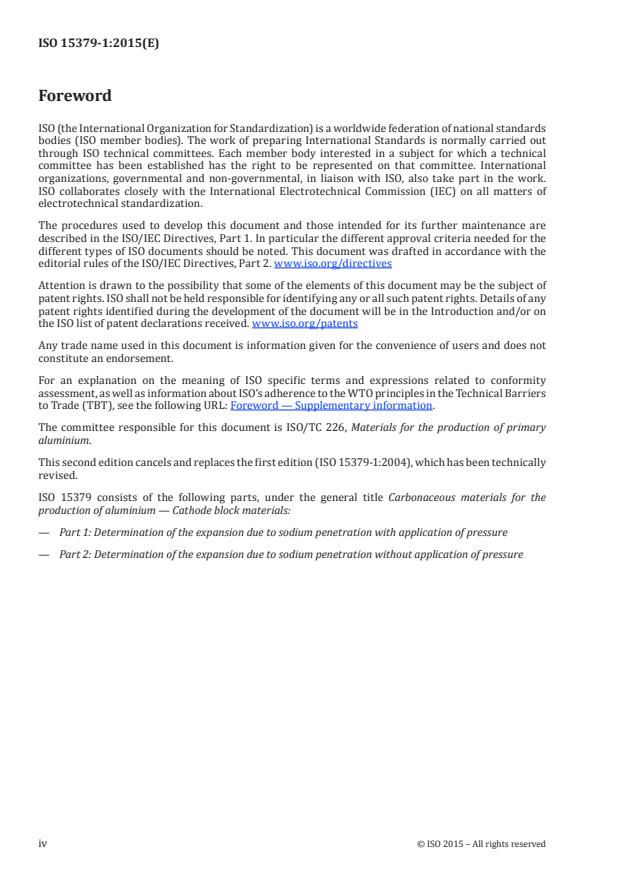 ISO 15379-1:2015 is a standard published by the International Organization for Standardization (ISO). Its full title is "Carbonaceous materials for the production of aluminium — Cathode block materials — Part 1: Determination of the expansion due to sodium penetration with application of pressure". This standard covers: ISO 15379-1:2015 specifies a method that covers the determination of linear expansion under external pressure due to sodium penetration in cathode-block materials used in the production of aluminium. The linear expansion of the blocks depends on the sampling direction due to anisotropy.
