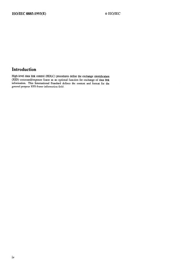 ISO/IEC 8885:1993 is a standard published by the International Organization for Standardization (ISO). Its full title is "Information technology — Telecommunications and information exchange between systems — High-level data link control (HDLC) procedures — General purpose XID frame information field content and format". This standard covers: Defines a single-exchange negotiation procedure for establishing operational characteristics when either one or more HDLC stations are capable of providing multiple selections. Provides a means for interchanging the necessary information to establish, at a minimum, a data link connection between two correspondents wishing to communicate. Describes the general purpose XID frame information field content and format. Defines encoding for information related to the basic HDLC standards only.