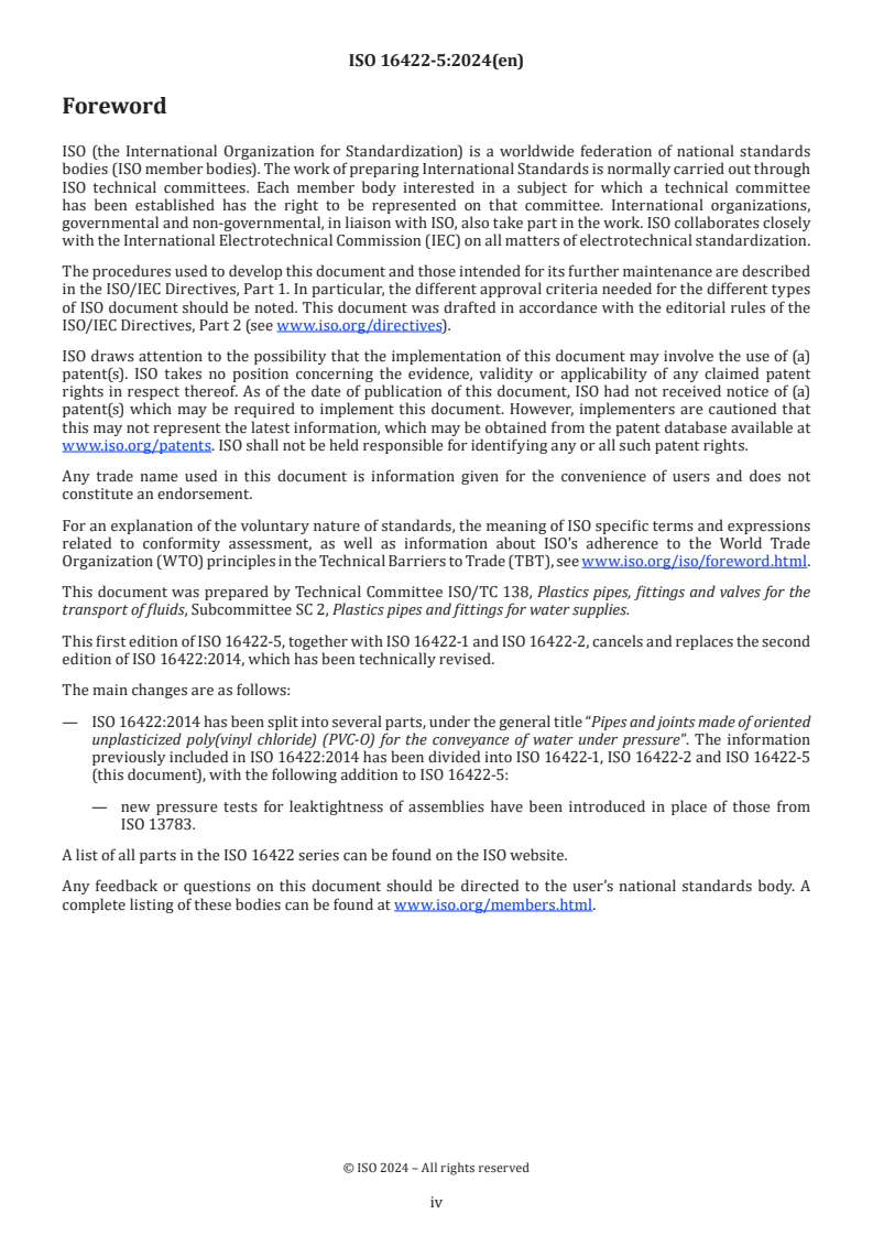 This part is best used in conjunction with ISO 16422-1, ISO 16422-2, ISO/TS 16422-3 and ISO 1452-3 to create a complete compliance and specification package for PVC-O pressure piping systems.