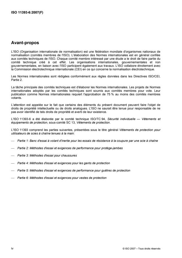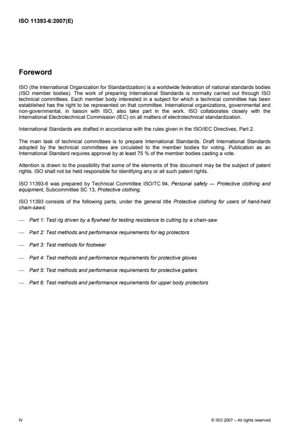 ISO 11393-6:2007 is a standard published by the International Organization for Standardization (ISO). Its full title is "Protective clothing for users of hand-held chain-saws — Part 6: Test methods and performance requirements for upper body protectors". This standard covers: ISO 11393-6:2007 specifies requirements for the protection offered by upper body protectors against cutting by a hand-held chain-saw. It also specifies the procedures for sampling and pre-treatment of upper body protectors, the measurement of the protective coverage, the apparatus and test methods for assessing resistance to cutting, and the practical performance test for evaluating ergonomic properties.