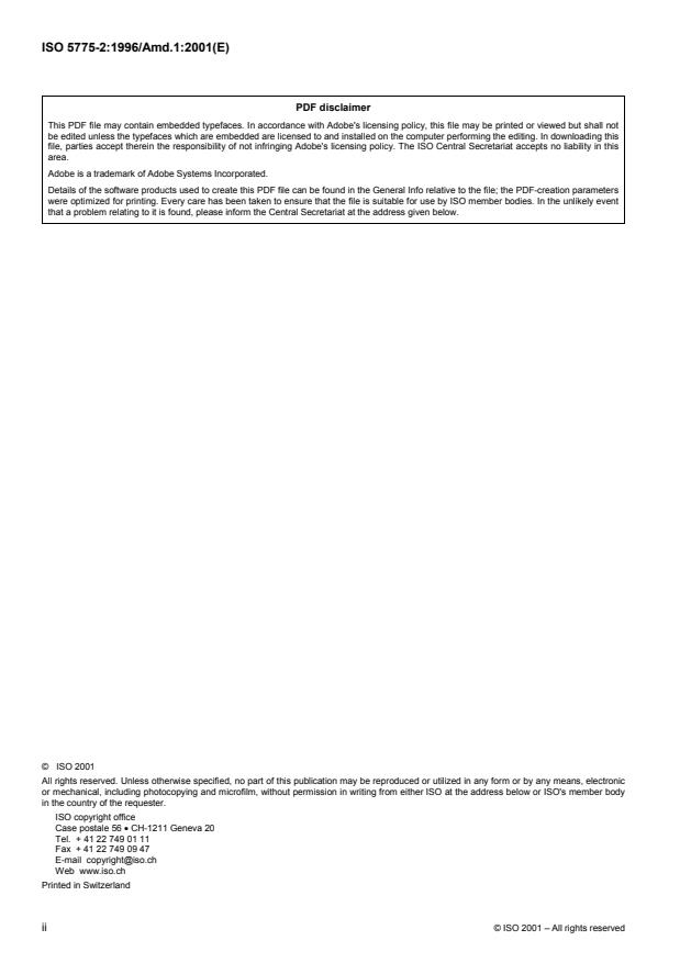 ISO 5775-2:1996/Amd 1:2001 is available in PDF format for immediate download after purchase. The document can be added to your cart and obtained through the secure checkout process. Digital delivery ensures instant access to the complete standard document.
