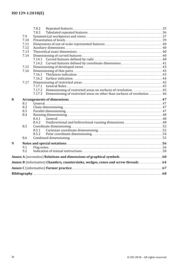 ISO 129-1:2018 establishes the general principles for presentation of dimensions and associated tolerances that apply to 2D technical drawings in all disciplines and trades but which can also be applied to 3D applications. ISO 129-1:2018 does not cover the application of dimensional tolerances and their meaning. See ISO 14405‑1 for tolerancing principles. This document can only be used to describe the nominal model of a drawing, not the non-ideal surface model (skin model) used for tolerancing purposes (for more information on tolerancing specifications, see the list of GPS standards listed as normative reference or as bibliography) Considering the ISO 14405 series, the presentation of tolerance indication is unambiguous when it is applied to a dimension which is a size and ambiguous when the dimension is not a size. All rules presented in this document are available for any type of drawing (see ISO 29845). In addition, this document introduces the concept of property indicators, developed length, between, surface indicators, flag notes and textual instructions. NOTE 1 All figures are shown in 2D views only. NOTE 2 Additional information and details for construction engineering are given in ISO 6284.