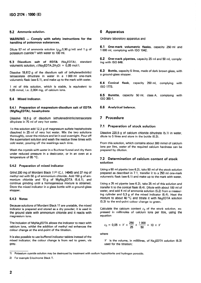 INTERNATIONAL STANDARD ISO 2174 : 1990 (E) Surface active agents - Preparation of water with known Calcium hardness 1 Scope 1 .l This International Standard specifies a method of prepar- ing water of known Calcium hardness for use in testing surface active agents and products containing them. 1.2 Systematic investigations have shown that, in many tests on surface active agents with hard water, there is no essential differente between Calcium hardness and magnesium hard- ness, so that these tests tan usually be carried out with an aqueous solution of Calcium chloride of known hardness. If, in certain cases, it is necessaty to use other ions that give rise to the hardness of water, this fact shall be mentioned in the test report. 2 Normative references The following Standards contain provisions which, through reference in this text, constitute provisions of this International Standard. At the time of publication, the editions indicated were valid. All Standards are subject to revision, and Parties to agreements based on this International Standard are encour- aged to investigate the possibility of applying the most recent editions of the Standards indicated below. Members of IEC and ISO maintain registers of currently valid International Stan- dards. ISO 385-1 : 1984, Laboratory glassware - Burettes - Part 7: General requiremen ts. ISO 648 : 1977, Laboratory glassware - Qne-mark pipettes. ISO 1042 : 1983, Laboratory glassware - One-mark volumetric flasks. ISO 1773 : 1976, Laboratory glassware - Boiling flasks (narrow-necked). ISO 3696 : 1987, Water for analytical laboratory use - Specifica tion and test methods. 3 Definition For the purposes of this International Standard, the following definition applies. water hardness: The property resulting from the presence of Calcium and magnesium salts and, in special cases, salts of strontium and/or barium. The unit of measurement of water hardness is the millimole per litre (mmol/l). 1 mmol/l of Calcium hardness corresponds to 40,08 mg of Calcium ions per litre. The equivalents for other degrees of hardness of water, as weil as other units used for measuring water hardness and the relationships between them, are given for information in annex A. NOTE - Originally, the hardness of a Sample of water was determined by measuring its power to destroy the foam formed by soap. This pro- petty is primarily due to the presence of Calcium and magnesium, but salts of other metals, such as iron, aluminium and manganese, behave in a similar manner, although these seldom occur in natura1 waters. 4 Principle Preparation of a stock Solution by dissolving an appropriate quantity of Calcium chloride in water. Determination of the Calcium in this stock Solution by complexometric titration with the disodium salt of (ethylenedinitrilo)tetraacetic acid (EDTA) using a mixture of Mordant Black 11 (C.I. 14645) and methyl red as indicator. Preparation of dilute solutions, of the hardness required, by dilution of appropriate volumes of the stock solution. 5 Reagents All reagents shall be of recognized analytical grade and the water used shall be grade 3 as defined in ISO 3696. 5.1 Calcium chloride dihydrate (CaC1,.2H20). lf the dihydrate is not available, use an equivalent quantity of another hydrate or the anhydrous salt. SIST ISO 2174:1995