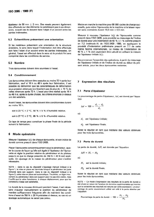 ISO 3385:1989 - Matériaux polymeres alvéolaires souples -- Détermination de la fatigue par indentation a charge constante