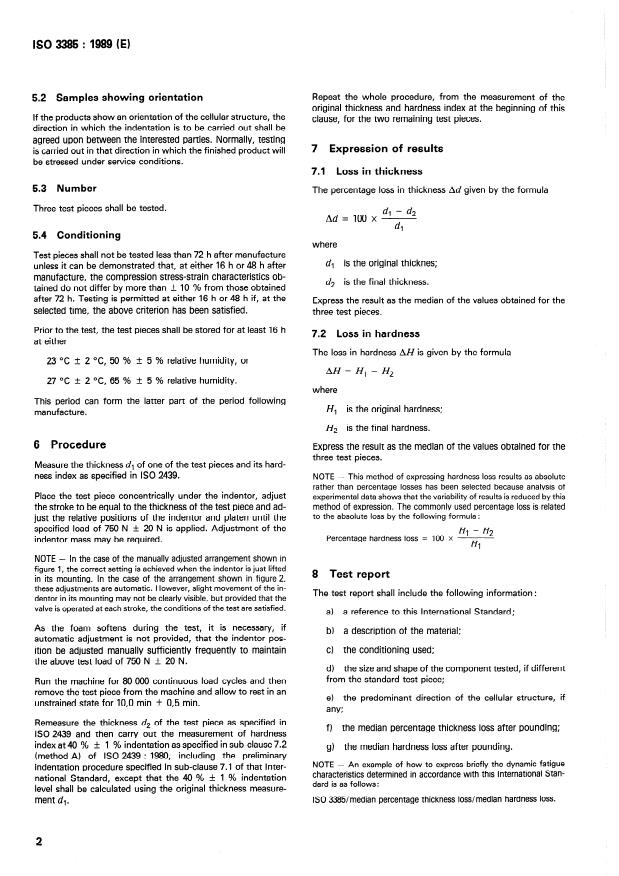 ISO 3385:1989 is a standard published by the International Organization for Standardization (ISO). Its full title is "Flexible cellular polymeric materials — Determination of fatigue by constant-load pounding". This standard covers: Specifies the determination of loss in thickness and loss in hardness of materials intended for use in upholstery. Provides a means of assessing the service performance. The method is applicable both to standard size test pieces cut from stock material and to shaped components. Formulas are given to express the loss in thickness and the loss in hardness. Two figures show the details of a manually adjusted machine and an automatically adjusted. Constitutes a minor revision of the second edition (ISO 3385:1982).