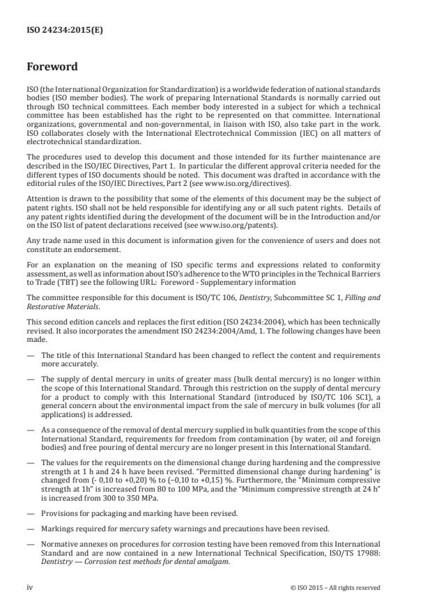 ISO 24234:2015 specifies the requirements and test methods for dental amalgam alloys that are suitable for the preparation of dental amalgam, together with the requirements and test methods for that dental amalgam and the requirements for packaging and marking (including those for dental mercury). It is applicable to dental amalgam alloys supplied in the form of a free-flowing powder in bulk, or a powder compressed to form a tablet, or a powder in a capsule (i.e. pre-capsulated).