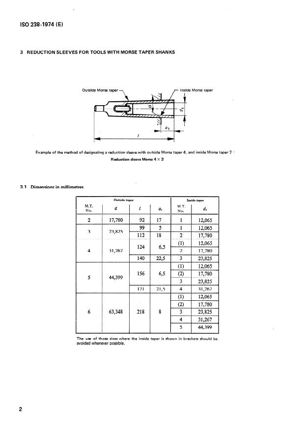 ISO 238:1974 is a standard published by the International Organization for Standardization (ISO). Its full title is "Reduction sleeves and extension sockets for tools with Morse taper shanks". This standard covers: Reduction sleeves and extension sockets for tools with Morse taper shanks