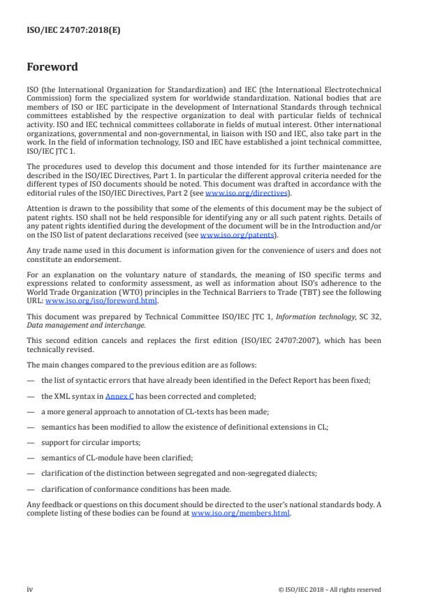 ISO/IEC 24707:2018 is a standard published by the International Organization for Standardization (ISO). Its full title is "Information technology - Common Logic (CL) - A framework for a family of logic-based languages". This standard covers: This document specifies a family of logic languages designed for use in the representation and interchange of information and data among disparate computer systems. The following features are essential to the design of this document. - Languages in the family have declarative semantics. It is possible to understand the meaning of expressions in these languages without appeal to an interpreter for manipulating those expressions. - Languages in the family are logically comprehensive ? at its most general, they provide for the expression of arbitrary first-order logical sentences. - Languages in the family are translatable by a semantics-preserving transformation to a common XML-based syntax, facilitating interchange of information among heterogeneous computer systems. The following are within the scope of this document: - representation of information in ontologies and knowledge bases; - specification of expressions that are the input or output of inference engines; - formal interpretations of the symbols in the language. The following are outside the scope of this document: - specification of proof theory or inference rules; - specification of translators between the notations of heterogeneous computer systems; - computer-based operational methods of providing relationships between symbols in the logical "universe of discourse" and individuals in the "real world". This document describes Common Logic's syntax and semantics. This document defines an abstract syntax and an associated model-theoretic semantics for a specific extension of first-order logic. The intent is that the content of any system using first-order logic can be represented in this document. The purpose is to facilitate interchange of first-order logic-based information between systems. Issues relating to computability using this document (including efficiency, optimization, etc.) are not addressed.