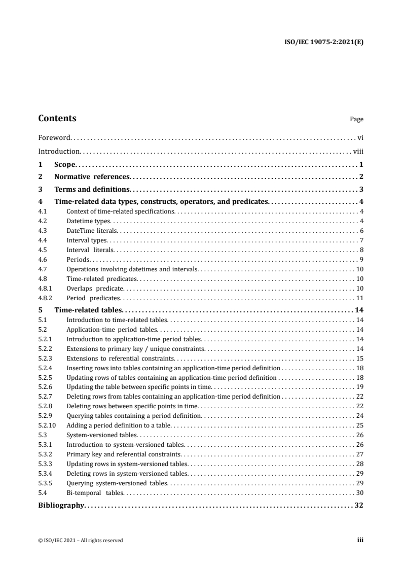 This part is intended to be used in conjunction with the ISO/IEC 9075 series (SQL), including parts 1 and 2 (Framework and Foundation) and other relevant ISO/IEC 9075 parts cited within the standard. Keywords: ISO/IEC 19075-2:2021, SQL time-related, temporal SQL, datetime types, system-versioned tables, bi-temporal tables, application-time period, timezones, SQL intervals.