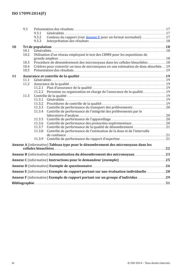 L'ISO 17099:2014 porte sur: a) la confidentialité des informations personnelles pour le demandeur et le laboratoire; b) les exigences de sécurité du laboratoire; c) les sources de rayonnements, les débits de doses et les gammes utilisées pour établir les courbes dose-effet d'étalonnage de référence qui permettent d'estimer les doses à partir des résultats du test des CBMN, ainsi que la dose minimum détectable; d) le prélèvement de sang, la mise en culture, le recueil des cellules après culture et la préparation des échantillons pour le test des CBMN; e) les critères de dénombrement; f) la conversion de la fréquence des micronoyaux dans les cellules binucléées en estimation de dose absorbée; g) la présentation des résultats; h) l'assurance et le contrôle de la qualité; i) les annexes informatives contenant des exemples de questionnaire, d'instructions d'utilisation, de tableau de dénombrement au microscope et de rapport, ainsi qu'une synthèse des avantages et limites des systèmes automatisés actuellement disponibles pour le dénombrement des micronoyaux.