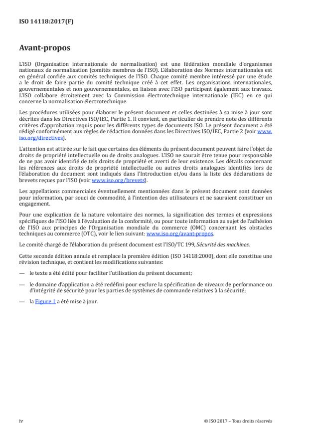 ISO 14118:2017 spécifie des exigences pour les mesures de sécurité intégrée destinées à empêcher la mise en marche intempestive d'une machine (voir 3.2), afin de permettre des interventions humaines en toute sécurité dans des zones dangereuses (voir l'Annexe A). ISO 14118:2017 s'applique à la mise en marche intempestive depuis tous les types de source d'énergie, c'est-à-dire: - alimentation en énergie, par exemple électrique, hydraulique, pneumatique; - énergie emmagasinée en raison, par exemple, de la pesanteur, de ressorts comprimés; - influences externes, par exemple effets du vent. ISO 14118:2017 ne spécifie pas de niveaux de performance ou d'intégrité de sécurité pour les parties de systèmes de commande relatives à la sécurité. Même si le présent document identifie les moyens disponibles pour la prévention de la mise en marche intempestive, il ne spécifie pas les moyens de préventions de mise en marche intempestive pour des machines spécifiques. NOTE Une norme de type C peut définir les moyens exigés pour la prévention de dommage lié à la mise en marche intempestive. Dans le cas contraire, il convient de déterminer les exigences d'une machine spécifique par une appréciation du risque n'étant pas inclue dans le domaine d'application du présent document.
