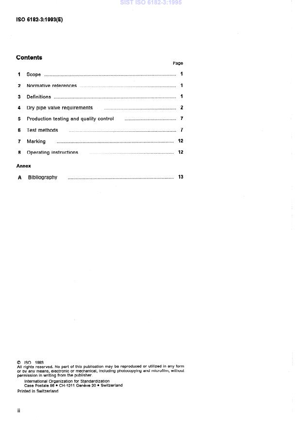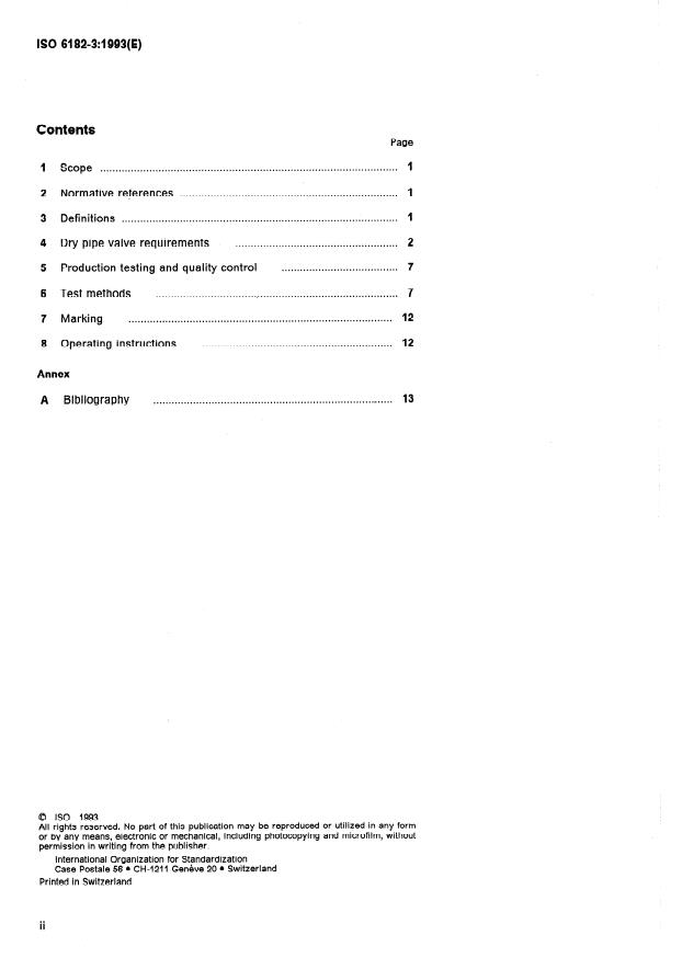 ISO 6182-3:1993 is a standard published by the International Organization for Standardization (ISO). Its full title is "Fire protection — Automatic sprinkler systems — Part 3: Requirements and test methods for dry pipe valves". This standard covers: Gives performance and other requirements, recommendations, and tests for dry pipe valves and relevant trim, as specified by the manufacturers. Performance and test requirements for other auxiliary components or attachments are not covered.
