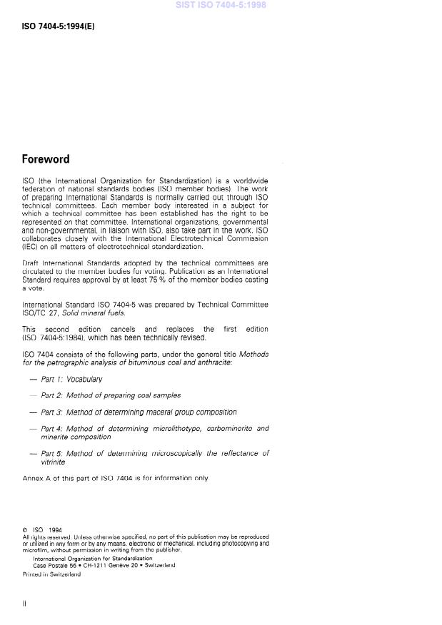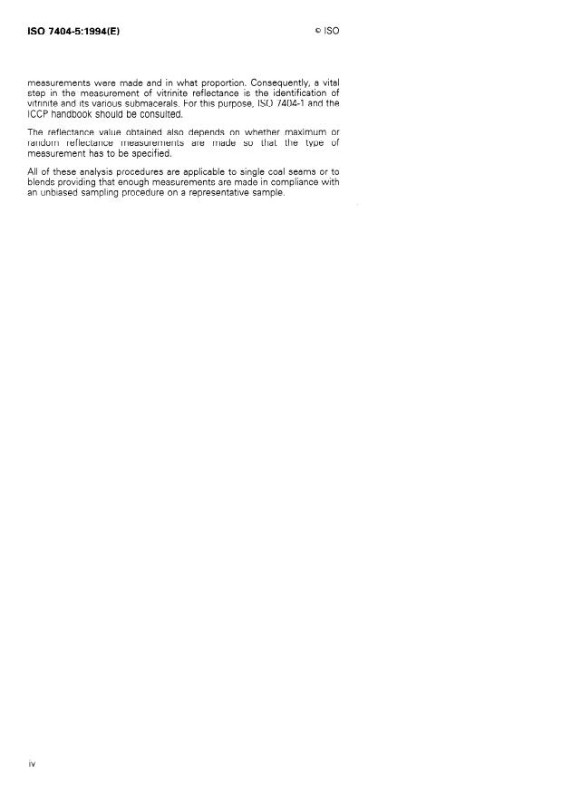 ISO 7404-5:1994 is a standard published by the International Organization for Standardization (ISO). Its full title is "Methods for the petrographic analysis of bituminous coal and anthracite — Part 5: Method of determining microscopically the reflectance of vitrinite". This standard covers: Cancels and replaces the first edition (1984). Specifies the method for determining microscopically the maximum and random reflectance in oil of polished surfaces of the vitrinite component of coals. Applicable to either coals from single seams or coal blends covering the whole range of bituminous coal and anthracite.