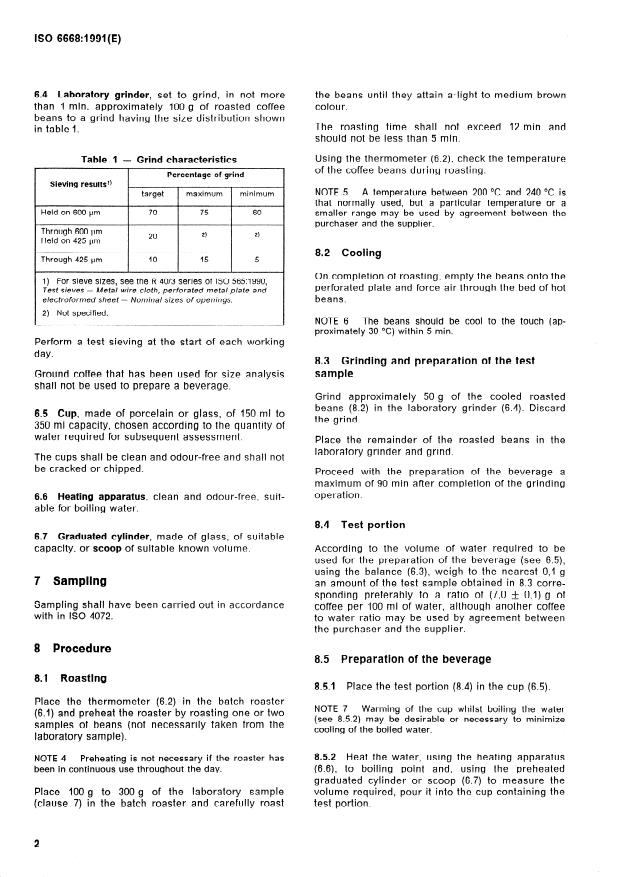 ISO 6668:1991 is a standard published by the International Organization for Standardization (ISO). Its full title is "Green coffee — Preparation of samples for use in sensory analysis". This standard covers: La présente Norme internationale prescrit une méthode de torréfaction du café vert, de préparation de l'échantillon de café torréfié et de la boisson destinée à l'analyse sensorielle. NOTES : 1- L'analyse sensorielle qui sefa effectuée à la suite de cette préparation servira éventuellement à l'acceptation ou au rejet d'une livraison selon les accords conclus entre les parties. En général, l'échantillon sera légèrement torréfié pour l'évaluation des défauts et moyennement torréfié pour l'évaluation de la flaveur et de la couleur (voir 8.1). 2- Une boisson préparée selon la présente Norme internationale peut non seulement être utilisée pour le contrôle de la qualité, mais aussi pour comparer différents échantillons; dans ce cas, un mode opératoire identique devra être suivi pour chacun des, échantillons (voir article 8).