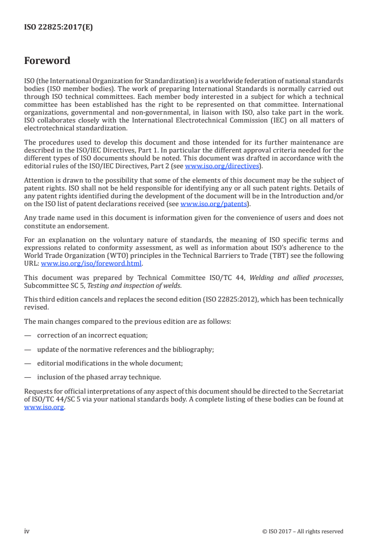 ISO 22825:2017 is a standard published by the International Organization for Standardization (ISO). Its full title is "Non-destructive testing of welds - Ultrasonic testing - Testing of welds in austenitic steels and nickel-based alloys". This standard covers: ISO 22825:2017 specifies the approach to be followed when developing procedures for the ultrasonic testing of the following welds: - welds in stainless steels; - welds in nickel-based alloys; - welds in duplex steels; - dissimilar metal welds; - austenitic welds. The purposes of the testing can be very different, for example: - for the assessment of quality level (manufacturing); - for the detection of specific discontinuities induced in service. Acceptance levels are not included in ISO 22825:2017, but can be applied in accordance with the scope of the testing (see 4.1). The requirements of ISO 22825:2017 are applicable to both manual and mechanized testing.