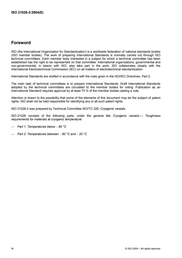 ISO 21028-2:2004 is a standard published by the International Organization for Standardization (ISO). Its full title is "Cryogenic vessels — Toughness requirements for materials at cryogenic temperature — Part 2: Temperatures between -80 degrees C and -20 degrees C". This standard covers: ISO 21028-2:2004 specifies the toughness requirements of metallic materials for use at temperatures between -20 °C and -80 °C to ensure their suitability for cryogenic vessels. It is applicable to fine-grain and low-alloyed steels with specified yield strength less than or equal to 460 N/mm2, aluminium and aluminium alloys, copper and copper alloys and austenitic stainless steels.