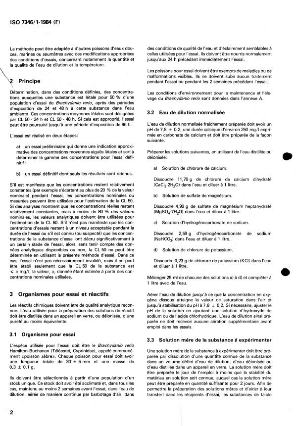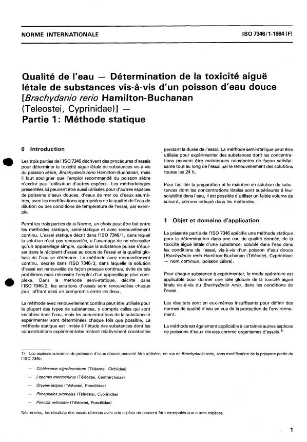 Qualité de l'eau — Détermination de la toxicité aiguë létale de substances vis-à-vis d'un poisson d'eau douce (Brachydanio rerio Hamilton-Buchanan (Teleostei, Cyprinidae)) — Partie 1: Méthode statique